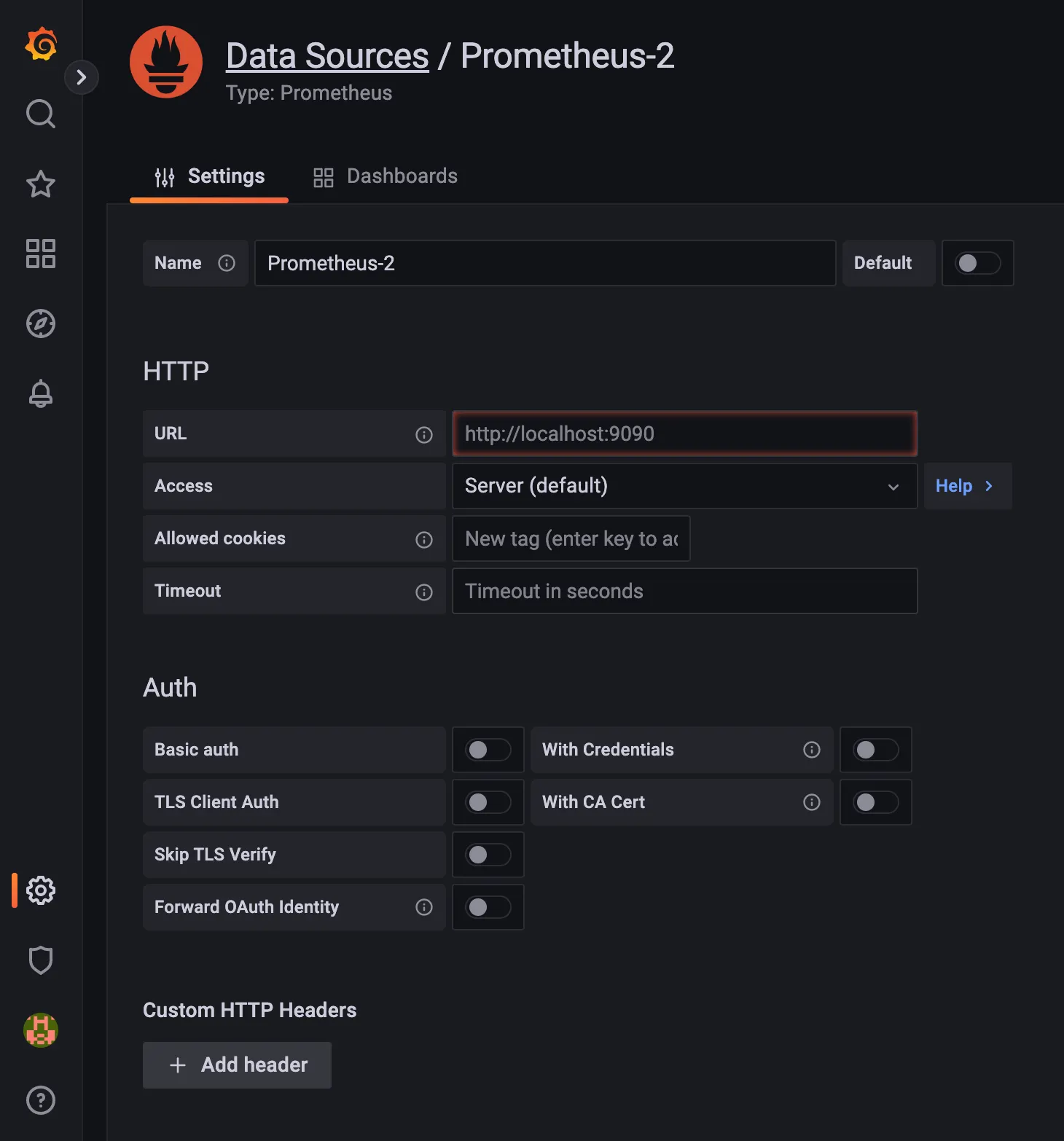 ν©λλ€. νμ¬ prometheus μ grafana κ° κ°μ μΈμ€ν΄μ€μ μκ³ , prometheus λ₯Ό 8080 ν¬νΈλ‘ μ€ννμκΈ°λλ¬Έμ URL μ localhost:8080 μ λ£μμ΅λλ€. λλ¨Έμ§λ κΈ°λ³ΈμΌλ‘ λκ³ save νμμ΅λλ€.